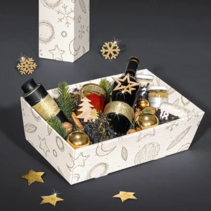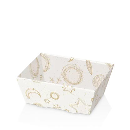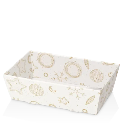Dieser viereckige Präsentkorb hat eine Oberfläche mit Strukturprägung und Weihnachtsmotiv. Der Boden ist weiß.