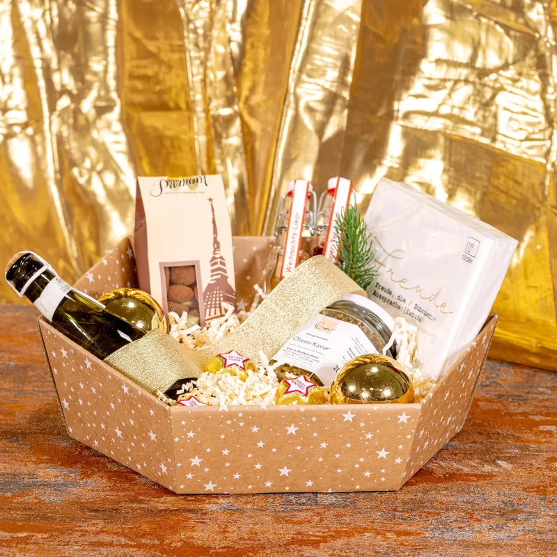 Diese sechseckige Präsentkorb unterstreicht besonders die Nachhaltigkeit unserer Produkte. Das weihnachtliche Motiv mit Sternen ist in Weiß auf einen braunen Naturkarton gedruckt. Die Innenseite ist ebenfalls naturbraun!