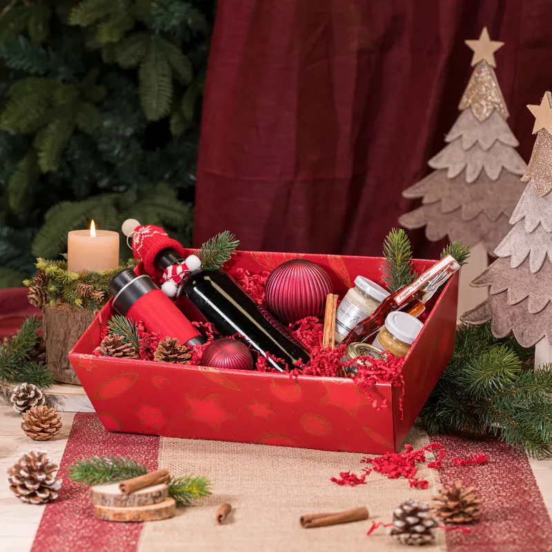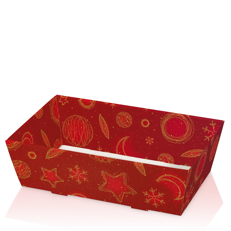 Dieser viereckige Präsentkorb hat eine Oberfläche mit Strukturprägung und Weihnachtsmotiv. Der Boden ist weiß.