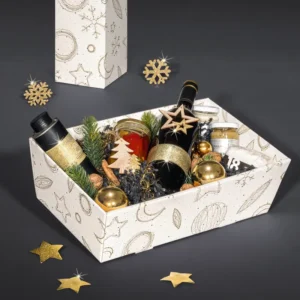 Viereckiger Präsentkorb in offener Welle und Heißfolienprägung an allen 4 Seiten,